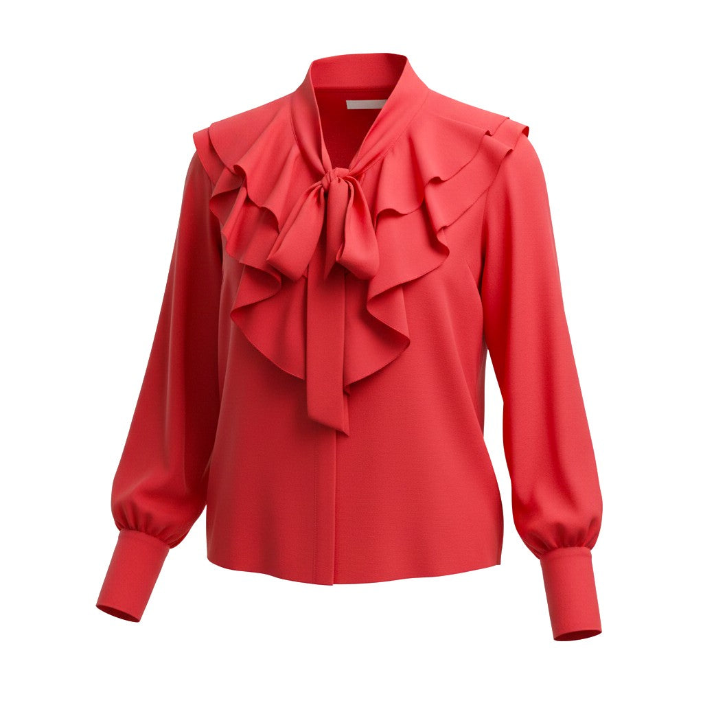 The Gunay Shirt comes in semi-sheer fabric with feminine trims, flattering detailing which grant this sophisticated blouse AM-PM status in your year-round wardrobe. Complete with an exaggerated frill dropped v neck pussy bow neckline, lantern sleeves and oversized cuff detail.