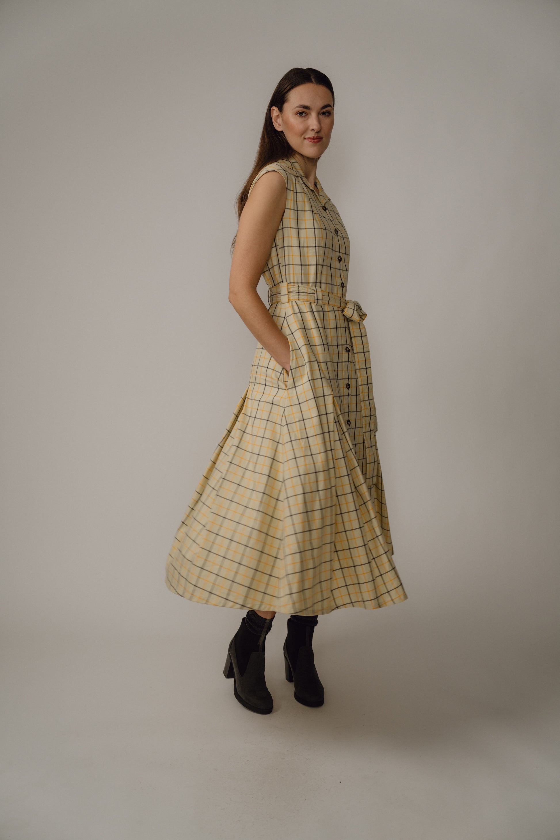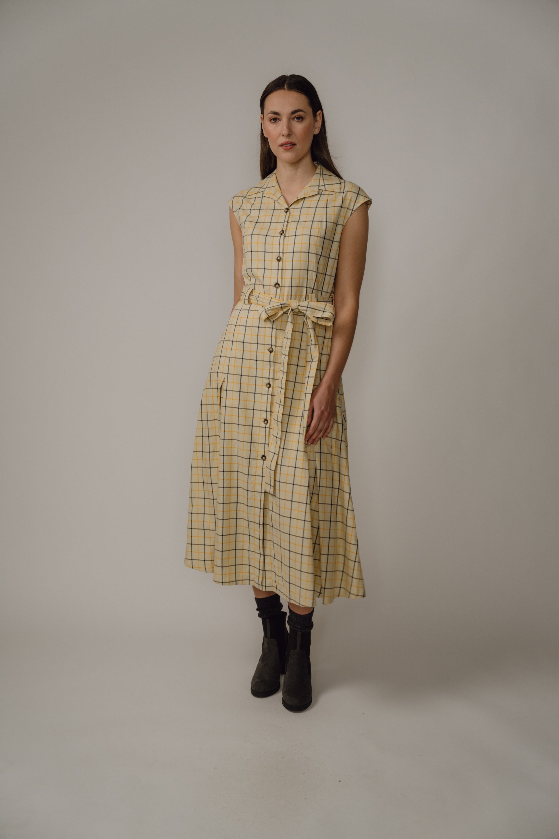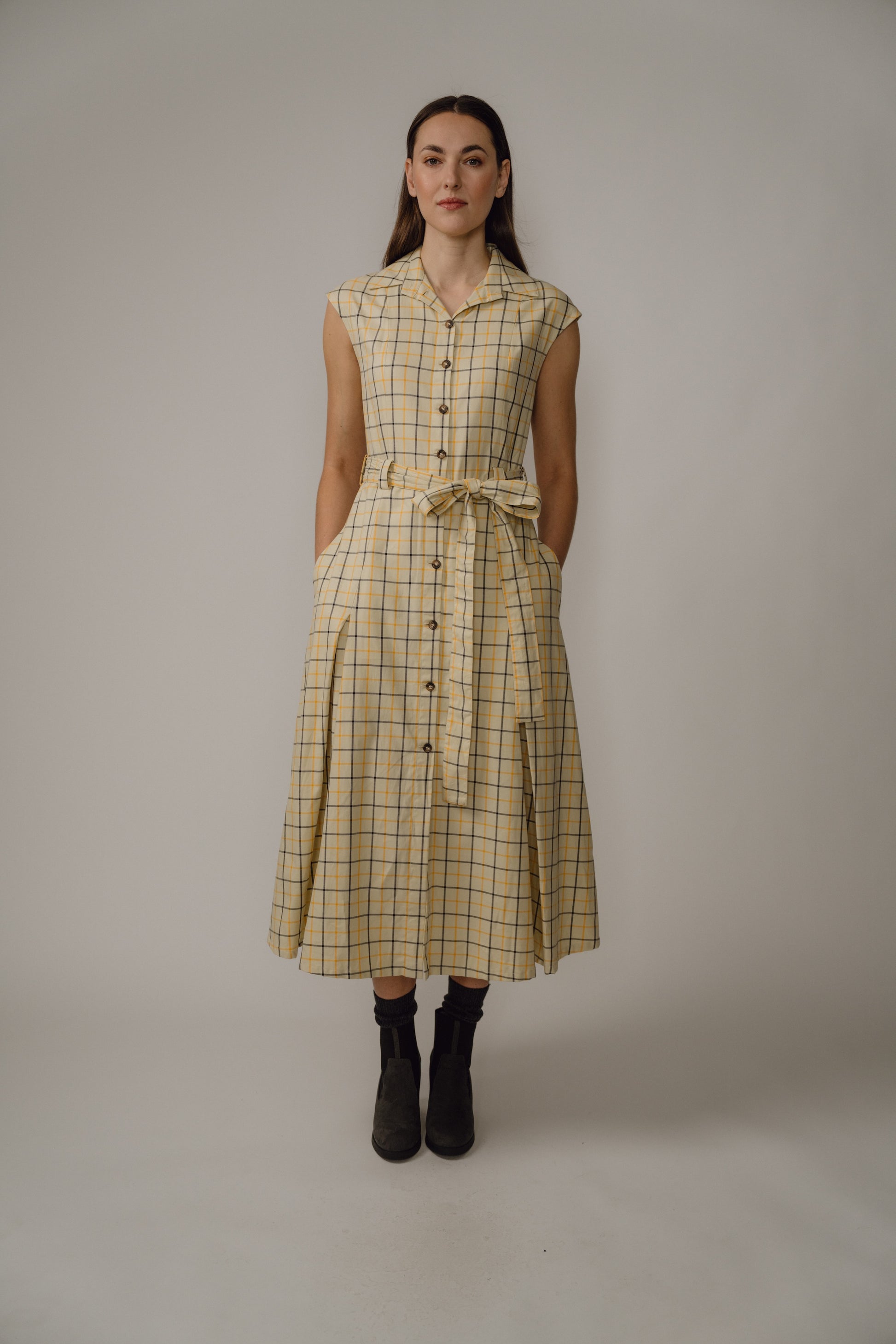 This gracefully fantastic shirt dress with pockets, (yes pockets - we love a pocket!) has stunning inverted pleats (two and front and two at back, button fronts, tie belt and elegant just off the shoulder sleeve. it has a beautifully fitted waist. A classic style with contemporary details this dress can be worn by itself or layered over a shirt or worn open as a waistcoat.
