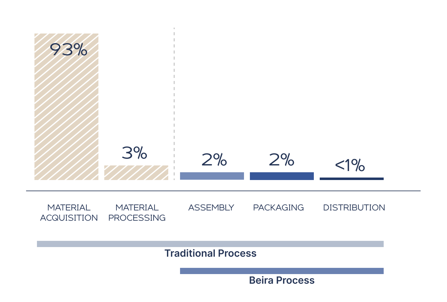 At Beira, we exclusively source deadstock yarns and trims, keeping our carbon pollution at the raw materials and textile processing stage to a minimum - that alone accounts for 94% of our Luxury Cotton Sock’s carbon footprint.