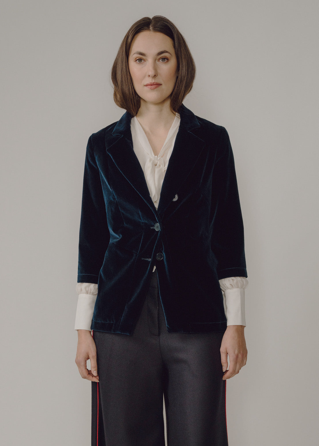 This elegant jacket is designed for effortless beauty and is the same as our Jeanne Jacket. Its pattern is derived from the Elena model; it features a longer fit and an enhanced cut along the hips, while preserving the delightful bracelet-style sleeves.
