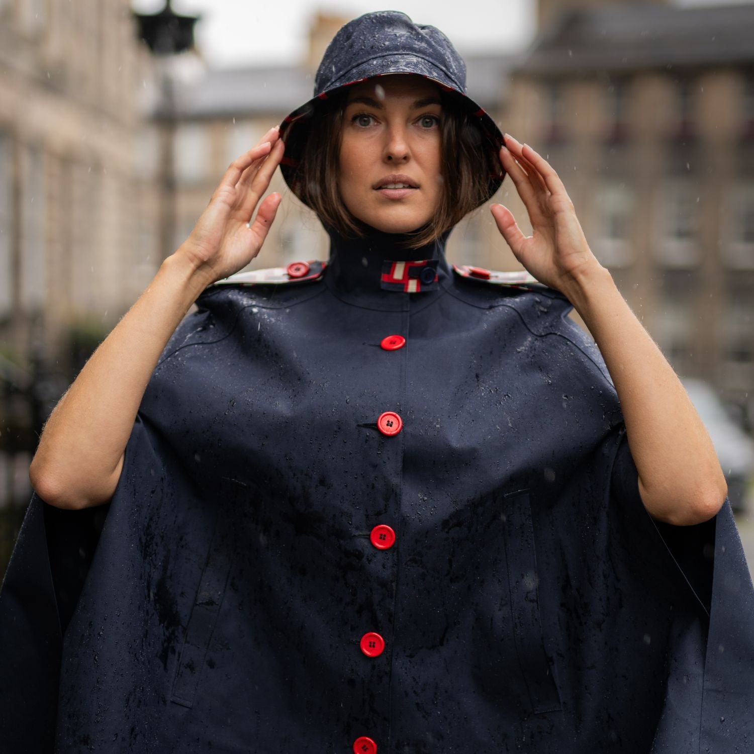 Our Nadia capes boast a proud Scottish heritage. Using a vulcanised rubber-bonded cloth and made using Thomas Hancock's traditional hand-cutting method. The capes are exquisitely cut and hand sealed. Natural, virgin rubber seals each seam with an expertly skilled artisan's index finger. Traditional tools ensure each and every tape's firm bonding, bringing incredible quality to each handmade cape. Exclusivity and craftsmanship come together to create a truly unique garment. The artisans who make this product are paid more than a living wage.