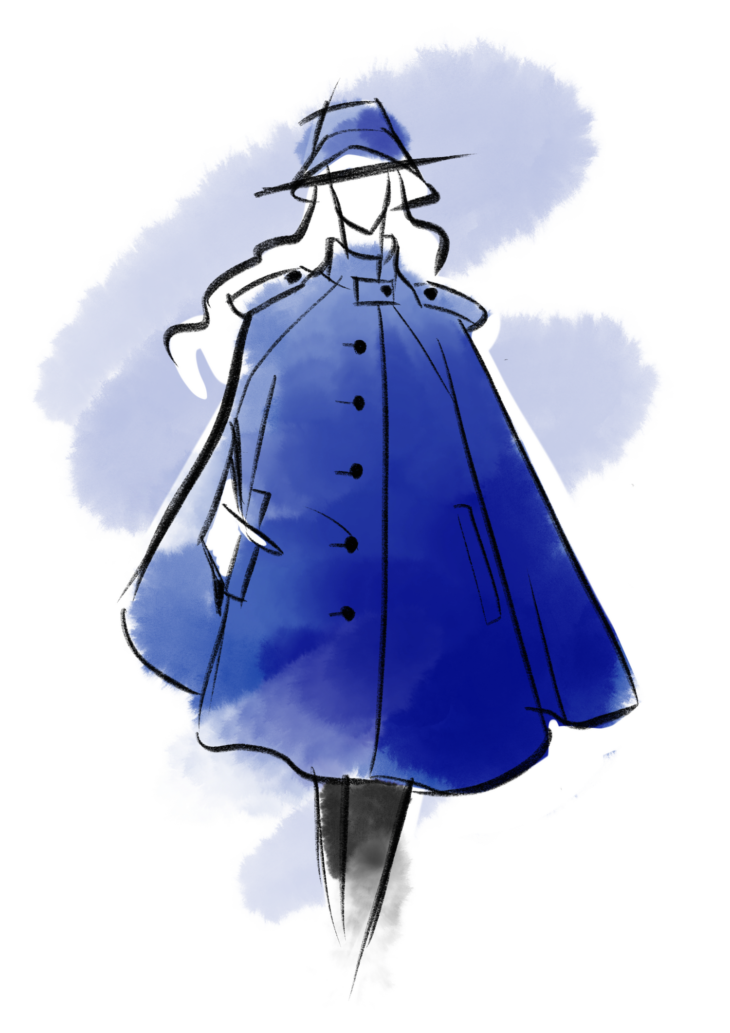 Its shape is elegant and dramatic. Featuring raglan cut shoulders, gold or navy buttons, reversible epaulettes and two carefully positioned pockets.